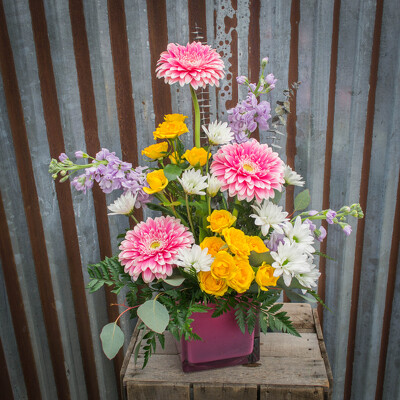 This pink glass cube showcases the most-amazing gerbera daisies you've even seen. Also including yellow spray-roses, white daisies, fragrant lavender stock, silver-dollar eucalyptus, and baby-blue eucalyptus greens...this arrangement will bring a smile to mom's face for sure.